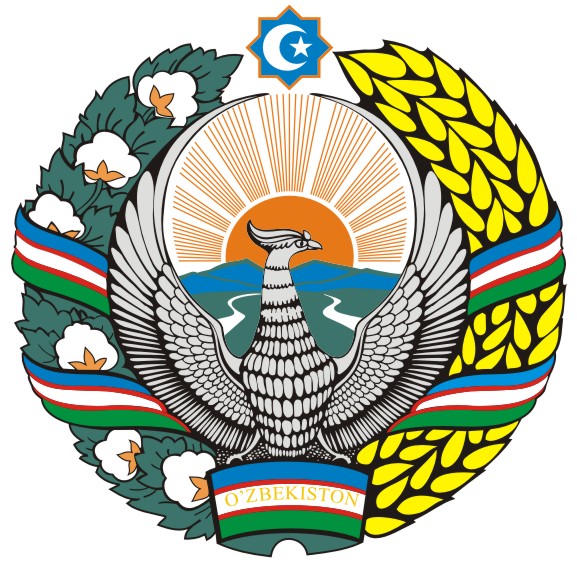 Ўзбекистон Республикасининг Давлат герби гуллаган водий узра чарақлаб турган қуёш тасвиридан ҳамда сўл томонида буғдой бошоқлари, ўнг томонида очилган пахта чаноқлари суврати туширилган чамбардан иборат.